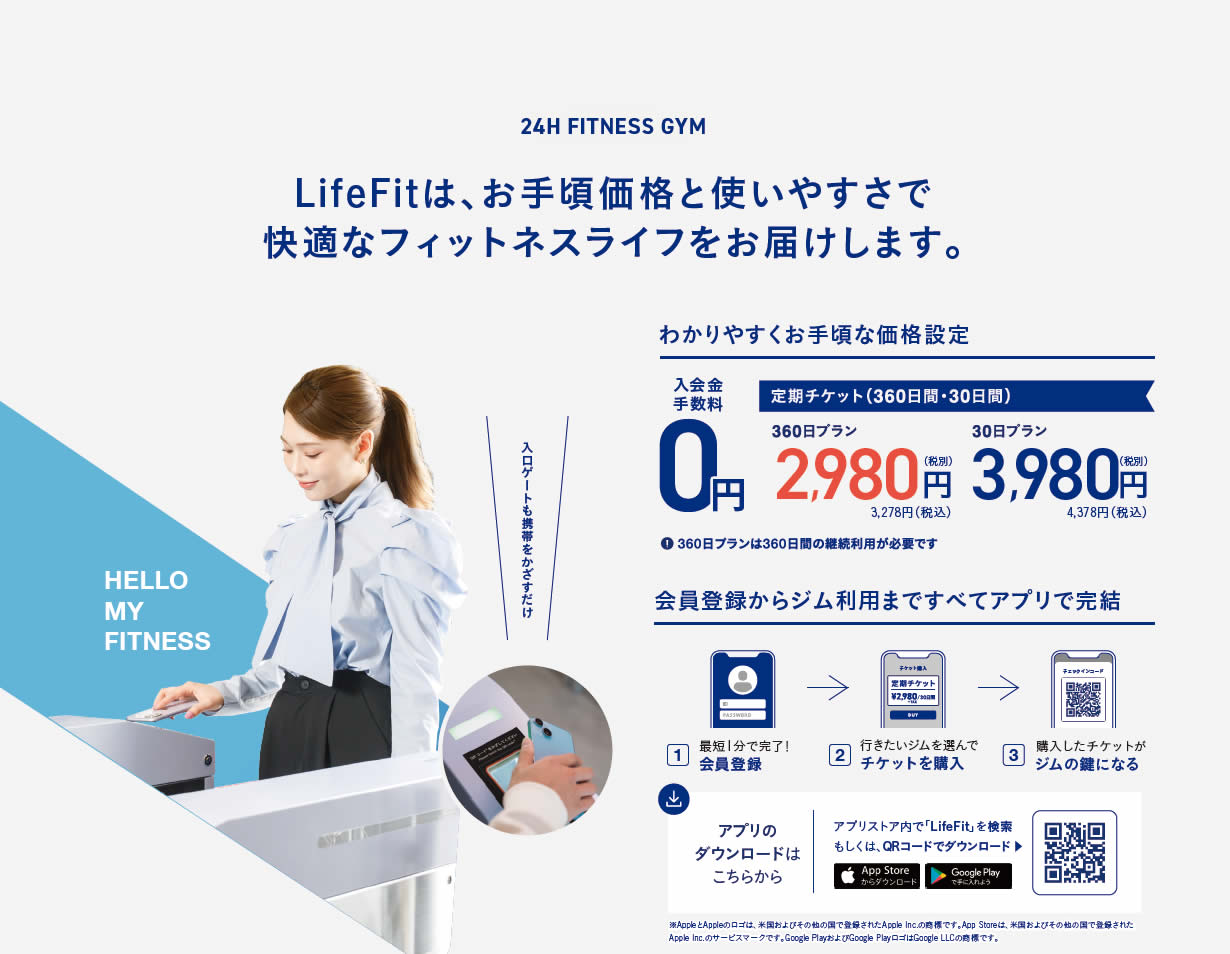LifeFit(ライフフィット) は、入会から退会、決済、入退室まで、すべての手続きをスマートフォンアプリで完結できる、24時間年中無休の次世代型フィットネスジムです。